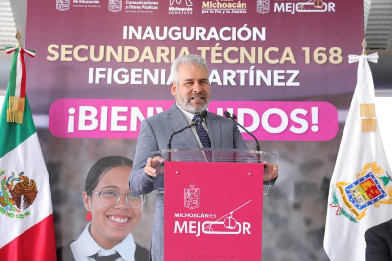 Morelia, Michoacán, 12 de enero de 2026.- Para el impulso y mejora de la educación de más de 800 alumnos de Villas del Pedregal, el gobernador Alfredo Ramírez Bedolla inauguró la Escuela Secundaria Técnica 168 “Ifigenia Martínez”, obra que forma parte del complejo educativo más grande que se construye en Michoacán con recursos estatales.